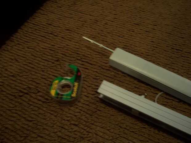 Las persianas temporales no tienen mucho peso en su parte inferior. Por esta razón quité la barra metálica del interior de la tapa de la barra (esta permitida para la función de cierre de las persianas mini barra). Me inserta en la parte inferior de los tonos y con cinta en los extremos.