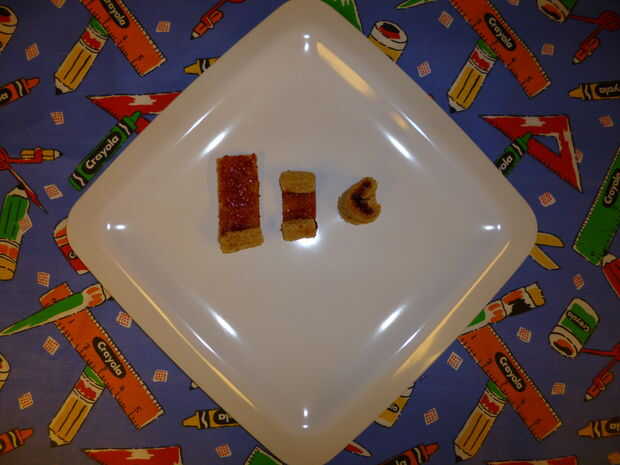• Unte un poco fresa jalea sobre el pan cortado y luego cortar en tercios.  (Microondas la gelatina facilita la extensión)