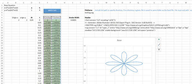 Revisa la hoja de trabajo de muestra, que tiene la ecuación para una rosa. Jugar con los valores para una para cambiar la escala, k para cambiar el número de hojas y dt para cambiar la resolución.