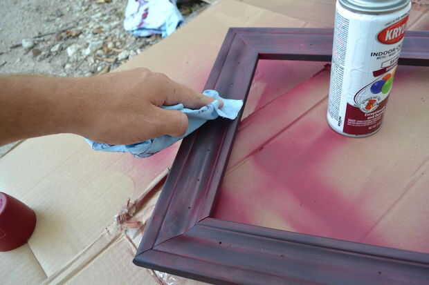 Ahora, la diversión parte. La clave para el look antiguo es aplicar la capa superior en secciones pequeñas, de 4-6 pulgadas. La sección de pintura con suficiente pintura para cubrir, pero no va a pesado; aquí menos es más. Con una toalla de papel o wrag, rápidamente comienzan a limpiar la pintura. No tarda mucho. Arrastre suavemente la toalla sobre el marco hasta que tenga un aspecto rayado. Continúe hasta que se satisfacen sus instintos artísticos.