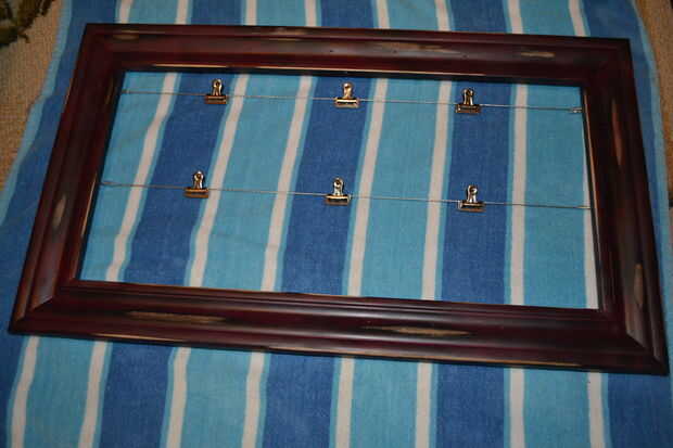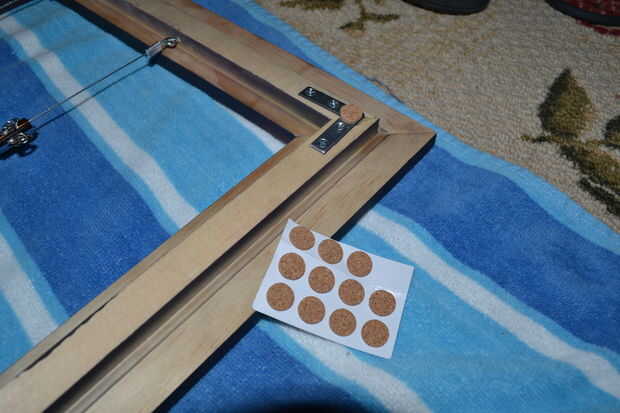 La altura interior del marco es 10". Tengo 2 pulgadas extras con la que se espacio los cables y dejar espacio para los clips. He instalado el primer cable 1" debajo del borde interior superior del marco. Medir hacia abajo 1" en lados de oposición y coloque una marca en el interior borde de la tira de listón. Enrosque un perno de ojo en cada uno de estos puntos. El segundo cable es 5 1/2" hacia abajo desde el interior superior borde. Otra vez Mida y marque 5 1/2" en las oposición listones y fije los pernos de ojo. Deje las armellas uno o dos giros por debajo de todo el camino en. Esto le permitirá más tarde la tensión del cable. Estos son los anclajes para el cable.