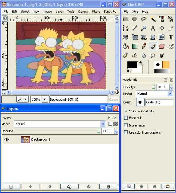 Ahora, abrir GIMP y arrastre la primera imagen en la ventana principal, cargarlo. Una nueva ventana con la imagen, debe saltar en el GIMP. También, debe saltar una ventana titulada "capas". Si no, presione Ctrl + L para traer para arriba. Debe haber una capa, en la actualidad, "Fondo", que contiene la imagen que se arrastró en GIMP.