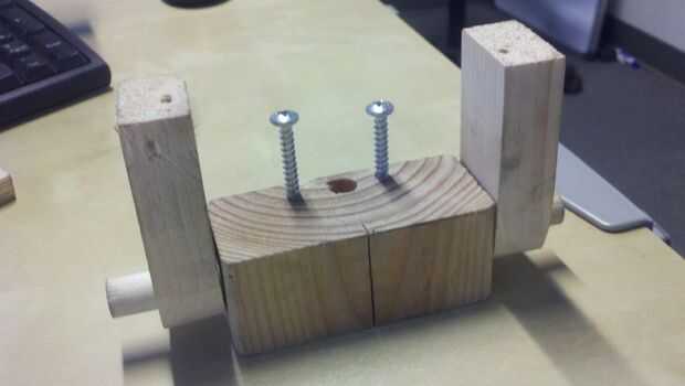 Corte una sección de 1 x 3 de una viga de 2 x 4. Perfore un agujero de 3/8 por el lado de 1 x 2, mitad de una pulgada arriba de la parte inferior. Tornillo de esta pieza en la parte frontal de la pieza de abrazadera superior (cerca de la pantalla). Medida del agujero en la parte inferior del objeto que desea que cuelgue de, luego corte dos pedazos de una pulgada de ancho que son una pulgada más larga que la longitud que desee. Taladre un agujero del mismo tamaño en estas y que encajen en la espiga a ambos lados de su bloque de pivote.