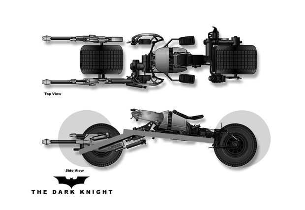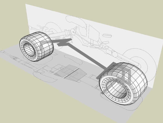 Un recurso increíble es un sitio llamado www.ChicksLoveTheCar.com (que es considerado como la más completa Web de Batmobile en el mundo), y un miembro llamado Shaggy gentilmente ha subido modelos 3D de muchos de los vehículos. Importar uno de sus dibujos en Photoshop para ayudar a visualizar la estructura. Puesto que las ruedas no podían soportar ningún peso, decidí que la horquilla delantera va hacia el lado opuesto de la rueda para ayudar a ocultar el marco llega a la tierra (porque necesitaba el "lado de la belleza" a la izquierda en la pantalla de mi).
