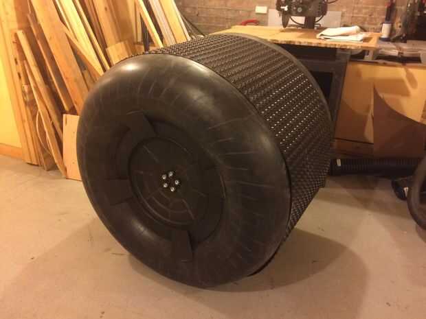 Las dos ruedas están hechas de cuatro 40" diámetro tubos interno del carro (10.00-20) (que se pueden comprar usados en eBay para $13). Un bote de basura tapa "hub" y pvc tubos de con cuerdas elásticas crea el marco de los neumáticos. Luego la Asamblea es enrollada con una hoja de Platon piso contrapiso (cortado a la medida) y aseguró un pequeño amortiguador auxiliar. La costura va en la parte inferior de la rueda para ocultarlo.