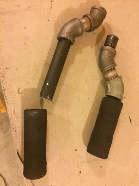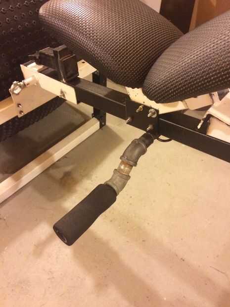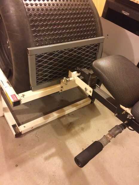 Las empuñaduras en el Banco de entrenamiento (utilizado en la barra de la inmersión de tríceps) fue añadido a algunas instalaciones de tuberías más grandes y repurposed como descansa la rodilla. Entonces empernado un pedazo de malla de acero (rescatado desde el interior de una camioneta de carga) en su lugar para servir como la rueda trasera "de guardia". Por último, os adjunto estriberas del palillo de pogo en el chasis para que sea fácil apoyar los pies en la posición adecuada de conducción.