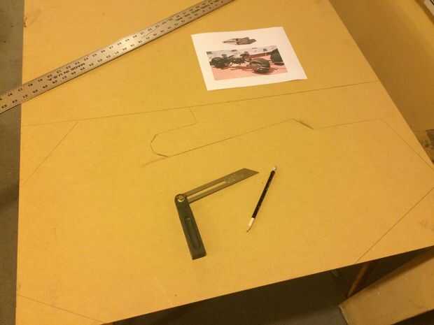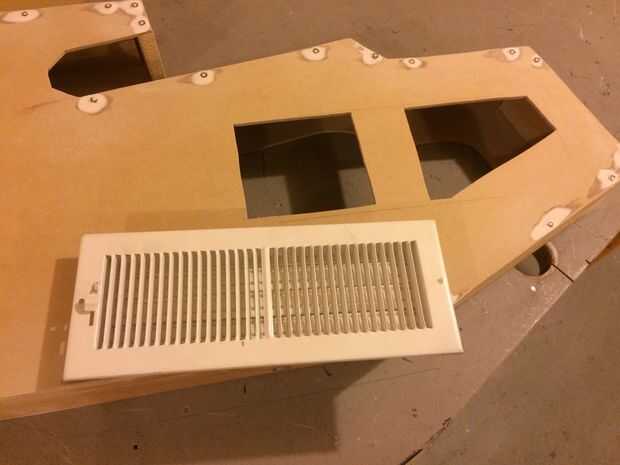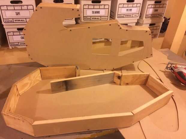 Hice las torretas para la rueda delantera por jigsawing un patrón de unos restos de madera. A continuación os adjunto una vieja cubierta de ventilación, algunos tubos de pvc y un par de bases de la lámpara de lava para algunos añadido detalle.