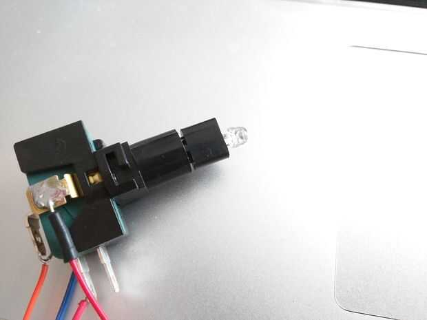 Un paso opcional, que es un poco complicado, es separar el botón LED y la combinación LED/resistor de intercambio. De forma predeterminada, el LED en el botón está conectado a un resistor adecuado para 12V. Como sólo tenemos voltios de 3c3, el PIN del LED D1 encendido es casi invisible. Tan trate de girar el interruptor del botón ligeramente, hasta que se suelte el botón. Luego quite la parte superior, que contiene el LED. Sacar con cuidado el LED por enderezar los pines del LED, entonces usted verá que una pierna tiene una resistencia soldada directamente a él. Desoldar la resistencia y sustituirla por el resistor de valor inferior, por ejemplo, el resistor de 47 ohmios. Poner todo junto otra vez.