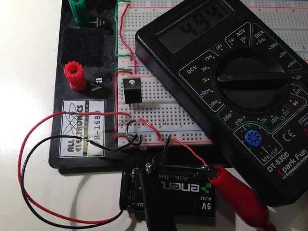 Esto está muy bien, pero esta configuración es siempre. Se desea configurar un interruptor, para que el baord se puede activar y desactivar. Pegar un interruptor entre el clip + 9 voltios de la batería y el Pin 1 del regulador.