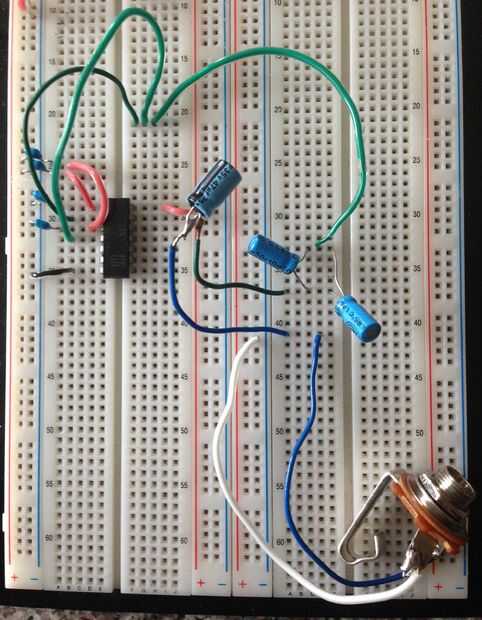 Las otras patas positivo de los dos tapones de 10uf deben conectarse el opamp 2 pines y 4. He utilizado cables de jumper adicionales repartidos por el tablero para que todas las conexiones se pueden ver fácilmente en la imagen. Normalmente usted no los necesita.