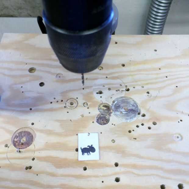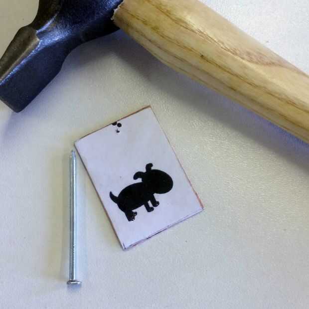 Utilice una escofi na para suavizar los bordes. Haga una marca con un clavo y un martillo para evitar que el taladro resbale lejos. Perfore un agujero (0,08 pulgadas) en el centro de su diseño y una más donde quieres tu anillo. Usted conseguirá algunas fresas así suavizan con una escofina.