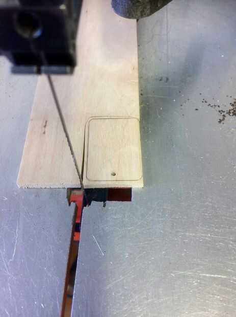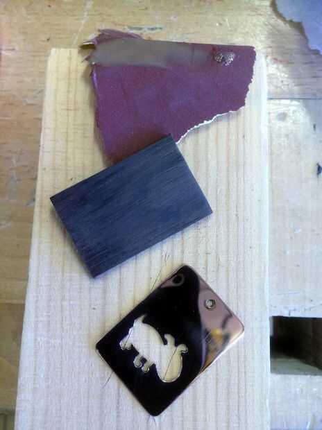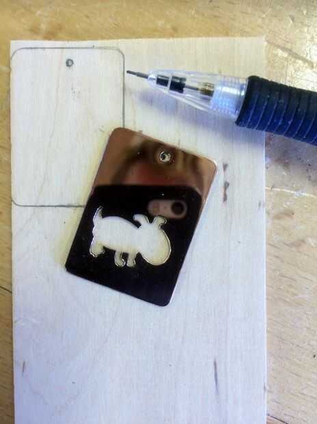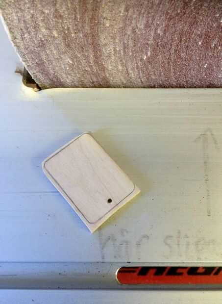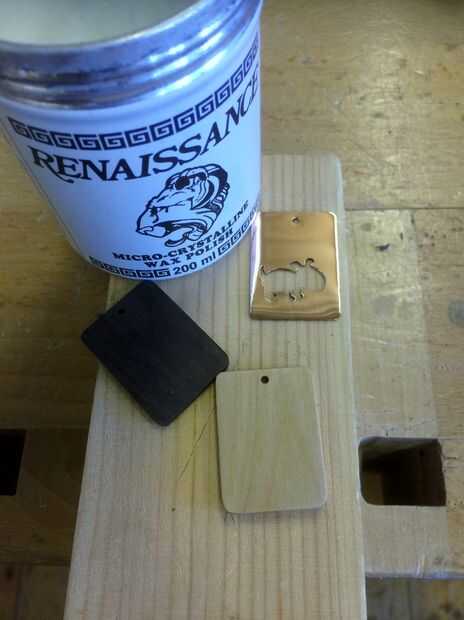 Use el colgante como una plantilla y dibuja el contorno sobre un trozo de madera. Agujero para anillo. Vio con una sierra de calar y luego la arena. Aplicar cera en la parte trasera y delantera.