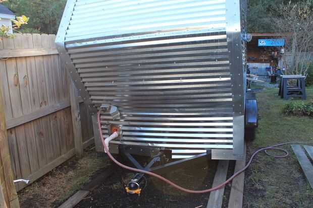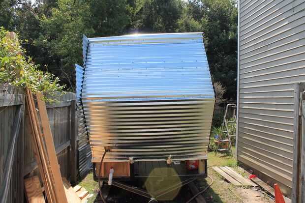 Una vez que haya completado ambos lados y el techo, el siguiente paso es extremo en la nariz del remolque con unas piezas especiales de corte. También añadir tornillos extras a la nariz para hacer un ajuste apretado seguro. Por último añadir la caja con la cubierta de la puerta para la entrada de agua.