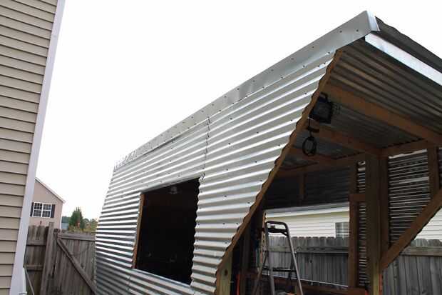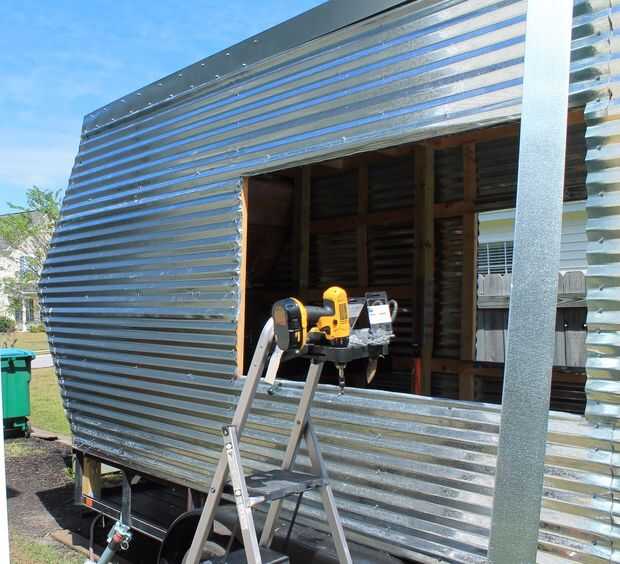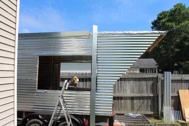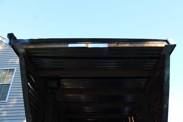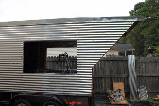 Una vez que el trailer estaba cubierto con chapa acanalada, solía papel sellado cinta en todas las costuras hacen estancos. Para la parte superior del remolque también usé sellador de alquitrán para techos como otro paso de la protección contra el agua. Una vez que puse la cinta y tar en su lugar, yo entonces cubrió con 4 "x 4" "L" cubierta casquillo del metal. Trabajaron perfectamente para la parte superior y abajo los lados del remolque.