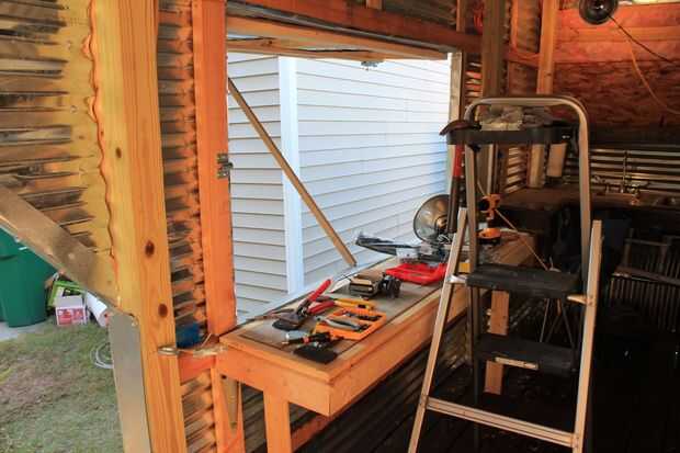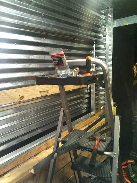 A continuación, construyó algunas tablas y había unido a la pared con bisagras. Esto me permite a cerrar las mesas durante el viaje y añade más espacio para carga del equipo. Para las patas de la mesa, pongo también en las bisagras, por lo que cuando saco las tablas a utilizar, el pliegue de las piernas hacia abajo con la gravedad y son inmediatamente en el lugar. Esto ahorra tiempo y espacio.