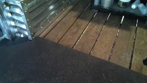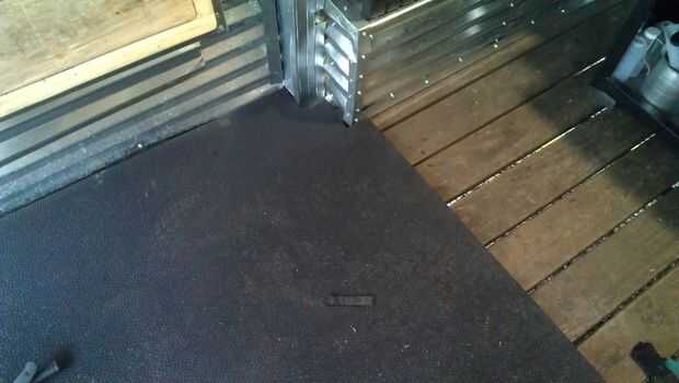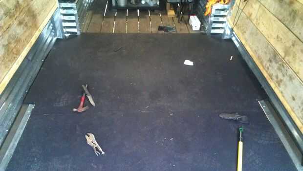 Con mi elección al principio del proyecto para reemplazar el piso con madera tratada a presión puedo manguera los tapetes con una manguera de agua sin temor a dañar la base. Limpiar los pisos por elevación el frente del remolque para crear una carrera cuesta abajo para el agua. Luego limpiar y aerosol a las esteras. El agua corre hacia la parte posterior y todo se limpia.