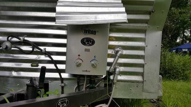 Pedir que más cómodo que he añadido un calentador portátil de agua caliente a la parte delantera exterior del remolque. Cuando se hace la plomería he dejado agujeros en la parte frontal inferior del remolque para ejecutar ambos, a y desde las líneas de agua. Coloqué el calentador de agua fuera el trailer que no se tiene ningún envenenamiento de monóxido de carbono del suceso.