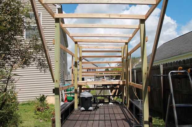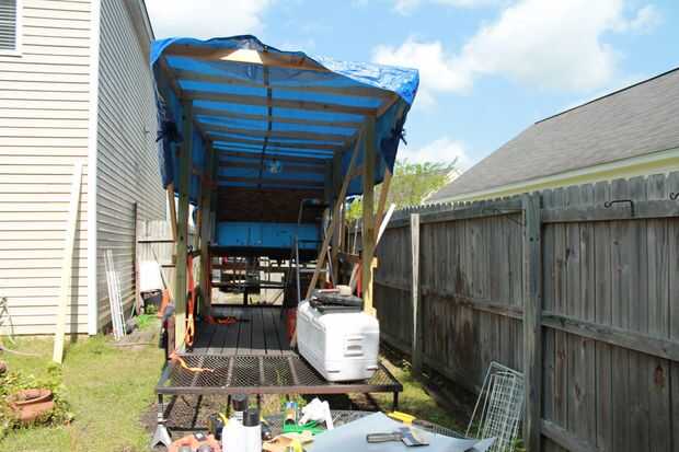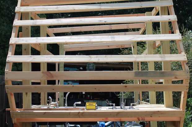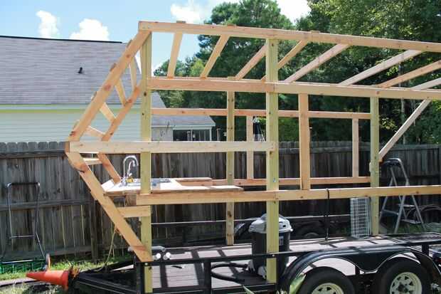 Una vez fui capaz de decidirme por un diseño, enmarcado con 4 x 4 y 2 x 4. El 4 x 4 fueron abulonado al piso del remolque junto con el lado del remolque. Usé una lateral en forma de V en la parte delantera para ganar espacio adicional para la zona de fregadero. Amplié la azotea posterior más allá de la parte posterior del remolque para crear un techo de un porche. Junto con hacer el lado izquierdo del remolque techo 3" superior a la derecha. Lo hice por dos razones. Primero fue para que agua no se sentaría en la azotea y segundo fue agua que cuando llueve no derramaré en mi ventana de servicio.