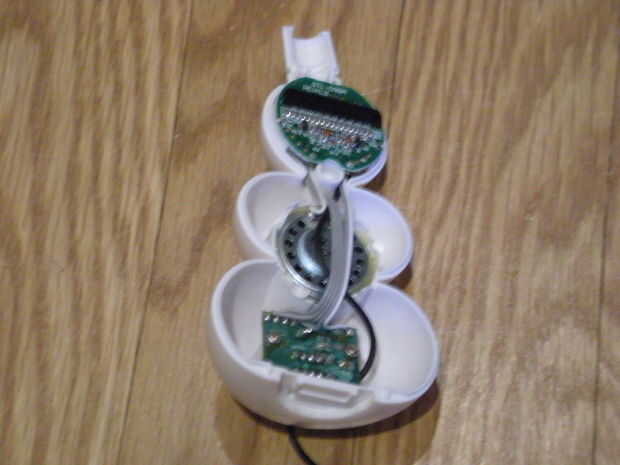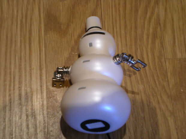 Lo voltee y esto revela un pequeño tornillo incrustado en el robot, quite este con su destornillador. Por último, habrá otro pedazo de goma en la base, como se ve en la segunda foto. Esto quite con un cuchillo y el muñeco de nieve debe venir bien abierta como se ve en la foto tres. Todas las piezas que se han apagado deben estar en cuadro 4. También Retire la lente que es el ojo de lo Cylon. Lo que queda son dos tornillos pequeños sosteniendo los interruptores en su lugar.