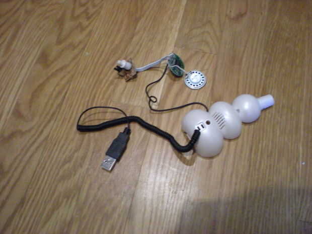 Esto es una parte muy delicada y no debe ser apresurado como lo hice. Hay un nudo que se ata para que no tiren del cable hacia fuera (ver foto dos), deshacer este nudo también. Si observa la primera imagen, el cabezal usb es demasiado grande para el agujero. Así que la dremel y hacia el agujero en el que está atrapado el cable USB. Esto es cuando el cable USB extra viene bien. Corte abierto, y con su cuchillo Pele los extremos de los cables rojo y el negro. Luego de la soldadura de estos a la ubicación donde fueron soldados los otros dos cables de alimentación. Si la polaridad está apagado, soldar el cable al revés. Ahora cuidadosamente tome el altavoz, el tablero principal, los conmutadores y el cable USB de la cáscara del muñeco de nieve.
