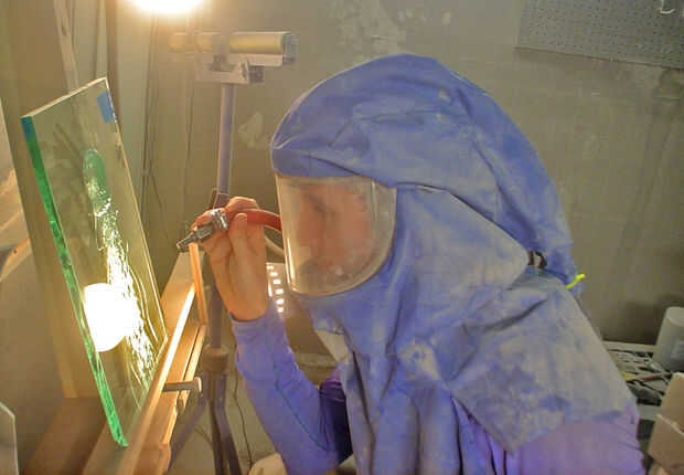 Colocar un vinilo arenado específico sobre el vidrio. Es bastante gruesa pero fácil de cortar. Se trata de resistir para el abrasivo que está arruinado.
