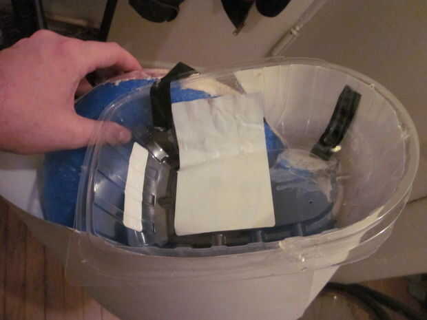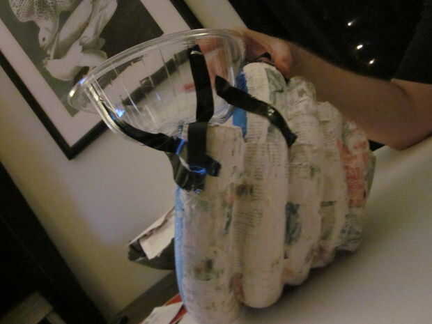 Primero caliente pegamento en la tapa de pollo para que quede perpendicular a la espiral. Luego utilice cartulina para crear al otro lado de la cáscara. Relleno de la cáscara con bolsas de plástico para que se vea completo.