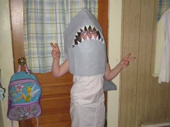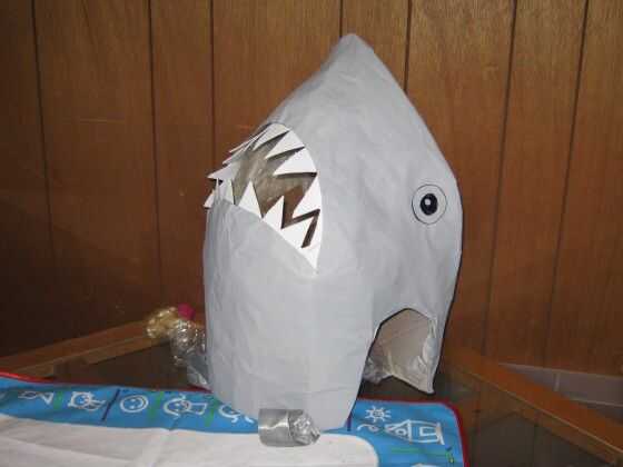 Luego hice tiburón dientes de una hoja fina de goma espuma de arte blanco. Puede conseguirlo en un lugar de la tela como Jo-Ann, o una tienda de artesanía como de Michael, o uno de muchas tiendas grandes que llevan arte provee (llegué a Wally una vez). Podría utilizar papel para los dientes, pero no doble la hoja de goma espuma delgada o doble y no hacer recortes de papel. Una vez que los dientes se recortan, aseguraron a la cabeza con más cinta de embalaje.