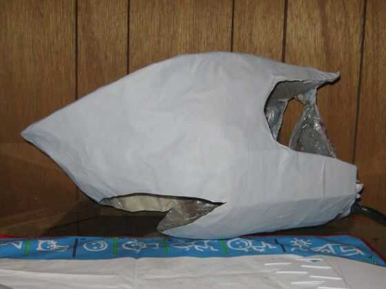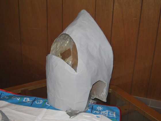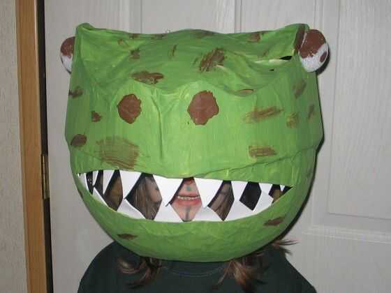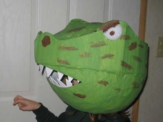 Las dos últimas fotos abajo son de traje pasado de años, un T-Rex. En que uno, el globo de 11 pulgadas se colocó con el vástago hacia delante, así que hocico de cabeza llegó a un punto, la parte superior de la cabeza fue construida con cartón y cinta, y los ojos fueron hechos de una bola de espuma de plástico cortada por la mitad. Todo esto fue apoyada por casco de bicicleta de niño, esconde y asegurado para el resto de la cabeza con ataduras de cremallera negro debajo de la cinta.