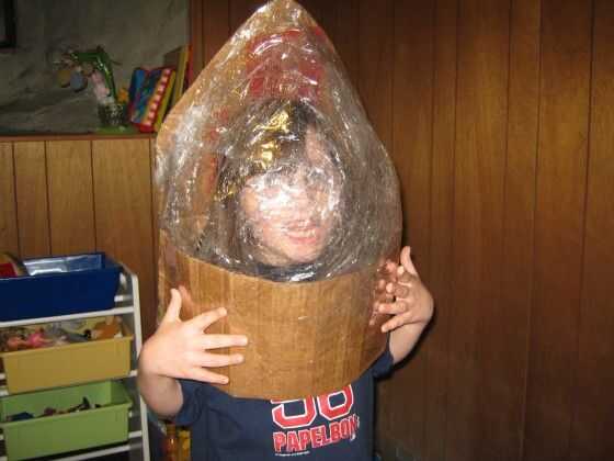 Decidió cortar brazo-huecos para los brazos que sobresalen y luego agregó dos tiras de cinta adhesiva dentro de la cabeza para actuar como correas para los hombros, al igual que un atrásVolver. Para asegurarse de que la cinta no atenerse a ella más tarde, pegué hojas de film transparente en el lado adhesivo de la cinta, mucho como en el último paso, así que las correas sólo están pegadas a la cabeza del traje y no el usuario.