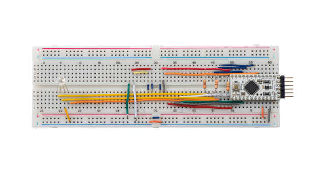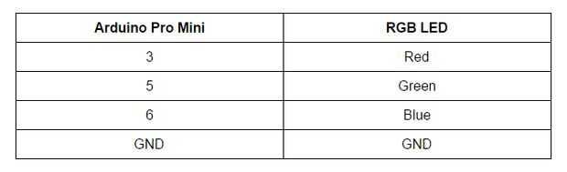 Nota: Asegúrese de que usted conecte un resistor entre el Arduino Mini Pro y cada uno de los pines de color RGB LED. También, si desea utilizar otros pines digitales para RGB LED, asegúrese de que los pernos tienen capacidades de PWM.