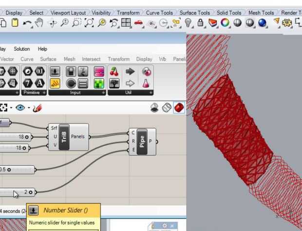 Después de que la superficie interna de la vía aérea se aísla, nosotros podemos mapa una cuadrícula sobre ella. Con un paramétrico como plug-in Grasshopper en combinación con Rhino facilita probar patrones y densidades de red diferentes. Más comúnmente, stents utilizan un modelo de somier, pero otros patrones también vale la pena explorar. Una doble hélice, espiral o un voronoi son entre otras formas que pueden asignarse a la superficie. Una consideración a hacer durante el proceso es que la cuadrícula está destinada a servir como un esqueleto estructural que resistirá la compresión mientras que también siendo flexible y adaptable al movimiento. Otra consideración interesante es que un stent es sólo unos centímetros de altura, pero la forma es fácilmente traducible/escalable a cientos de veces más grandes como una fachada del edificio.