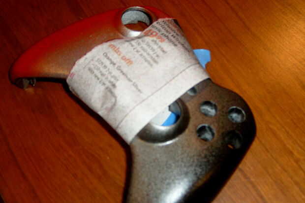 Para evitar esta área también mucha pintura, tomar una tira de periódico y utilizar cinta de enmascarar con cinta en su lugar, pero no a la parte frontal del controlador, envuelto mi papel alrededor de la parte delantera en la parte posterior y grabó allí así que no habría ninguna línea nítida donde ninguna pintura va. Luego asegúrese que el negro es en el mismo lado del regulador para el frente y atrás. No tengo ninguna foto de este proceso pero voy a intentar ser tan exactos como sea posible.