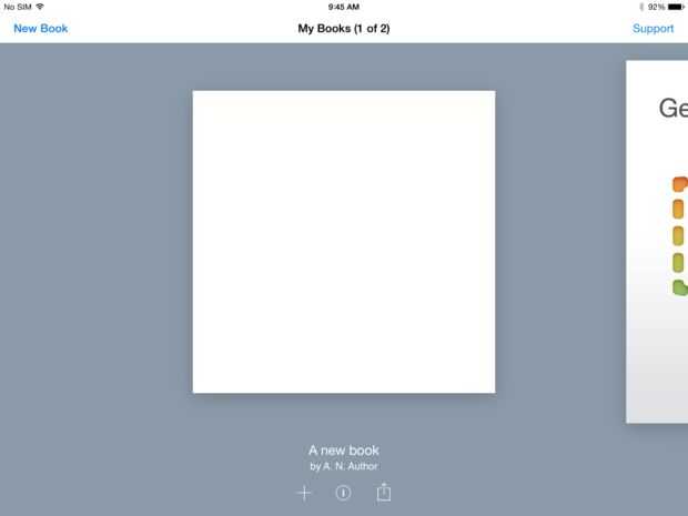 Abra la aplicación en su dispositivo y haga clic en la opción de libro nuevo. Usted tendrá la opción de trazado entre paisaje, vertical y cuadrado. Una vez que elija su diseño su libro abrirá a la portada.
