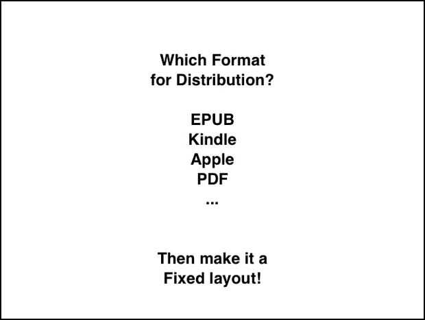 Cada formato soporta diseños fijos a su manera. El siguiente paso es averiguar cómo solucionar el diseño con el formato elegido. Como he dicho, con el autor de iBook es muy fácil, arrastrando y soltando el texto e imágenes. Con EPUB, creo que necesita para crear (o encontrar) una plantilla EPUB de diseño fijo. Mientras que los archivos PDF son fijos layout por defecto, generalmente no es fácil convertir a otros formatos de PDF, mientras que todo lo convierte a PDF. Si escoge para comenzar con otro formato, generalmente se puede crear una versión en PDF muy fácilmente.