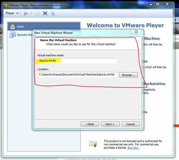 Obtendrá esta pantalla (abajo) el nombre lo que te gusta pero yo diría que sólo palo con Ubuntu 64 bits – dejar la ubicación