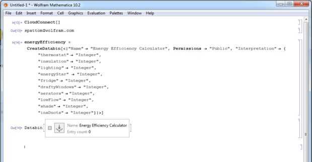 El funciton de [] de CreateDatabin le permite crear un databin en los datos de Wolfram la gota donde se almacenarán todos los datos y devuelve el objeto correspondiente de la Databin. Durante el uso de esta función, necesitamos definir lo que pasa en el Databin como su nombre y los permisos. Se muestra un ejemplo Databin para que la calculadora de eficiencia energética. Muestra la lista de datos con sus tipos de datos.