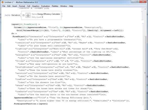 FO: = FormObject [< | " termostato"-> < |" Intérprete"-> {"Yes"-> 10,"No"> 1},"Control"-> RadioButtonBar,"Etiqueta"-> ¿tienes un termostato programable?" | >, "aislamiento" -> < | " Intérprete"-> {"Yes"-> 10,"No"> 1,"Tal vez"-> 5},"Control"-> RadioButtonBar,"Etiqueta"->"es su casa bien aislada? | >, "iluminación" -> < | " -> El intérprete de"{"La mayoría/todos"-> 10,"Alrededor de la mitad"> 5," muy pocos/ninguno "-> 1},"Control"-> RadioButtonBar,"Etiqueta"->"¿Qué porcentaje de la iluminación es CFL? | >, -> "energyStar" < | " Intérprete"-> {"Yes"-> 10,"No"> 1},"Control"-> RadioButtonBar,"Etiqueta"->"son lo electrodomésticos energyStar certificado? | >, "nevera" -> < | " Intérprete"-> {"1"-> 10,"2"-> 5,"3"-> 1},"Control"-> RadioButtonBar,"Etiqueta"->"refrigeradores ¿cuántos tienes?"| >, "draftyWindows" -> < | " Intérprete"-> {"Yes"-> 1,"No"> 10,"Tal vez"-> 5},"Control"-> RadioButtonBar,"Etiqueta"->"¿la casa tiene ventanas pararán?"| >, -> "aireadores" < | " Intérprete"-> {"Yes"-> 10,"No"> 1},"Control"-> RadioButtonBar,"Etiqueta"->"¿tienen los grifos aireadores?"| >, -> "MaxBlend" < | " Intérprete"-> {"Yes"-> 10,"No"> 1},"Control"-> RadioButtonBar,"Etiqueta"->"son el duchas de bajo flujo? | >, "sombra" -> < | " Intérprete"-> {"Yes"-> 10,"No"> 1},"Control"-> RadioButtonBar,"Etiqueta"->"La casa tiene arbustos y árboles para sombra?"| >, "insDucts" -> < | " Intérprete"-> {"Yes"-> 10,"No"> 1},"Control"-> RadioButtonBar,"Etiqueta"->"Son los conductos de calefacción en las áreas sin calefacción aislamiento?"| > | >, -> AppearanceRules < | " Title"->"Toma el Quiz de eficiencia de energía.","Descripción"->"una puntuación superior a 70 es eficiente de la energía!","SubmitLabel"->"Calcular"| >, FormLayoutFunction -> diseño]