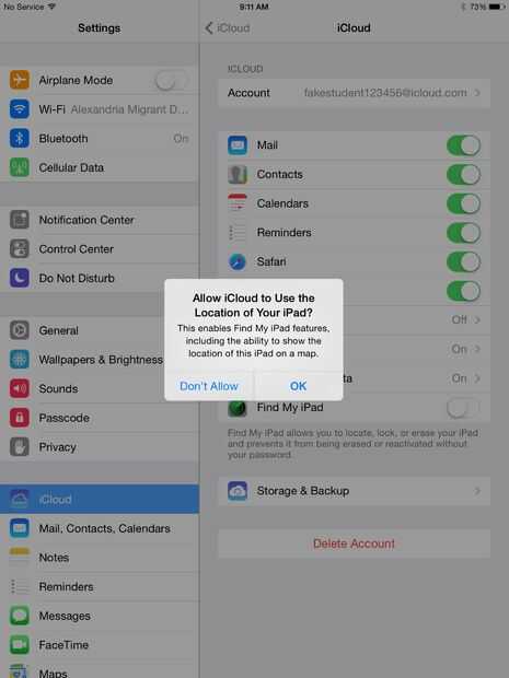 El siguiente pop-up ventana le preguntará si desea "ICloud permite utilizar la ubicación de tu iPad?" Elegir "OK" se encienda encontrar mi iPad que se puede utilizar para ayudar a rastrear tu iPad si lo pierdes. Esta característica también le da maneras de bloquear su iPad o incluso borrarlo si preocupa que has dejado en algún lugar que no tienes o alguien tiene el iPad que no tiene! Es una característica útil para haber activado, así que si este es su iPad, sugiero encender presionando "OK".