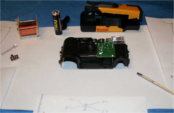 El condensador de estas cámaras mantiene una carga de alrededor de 300 voltios y puede darle una choque desagradable quemadura si se maneja incorrectamente, si tienes muy mala suerte podría incluso matar a alguien. Hay muchos sitios en internet sobre los peligros de estas cámaras y los métodos seguros de recuperación de las piezas de dentro de ellos. Busca por favor y ten cuidado de cualquier advertencia.
