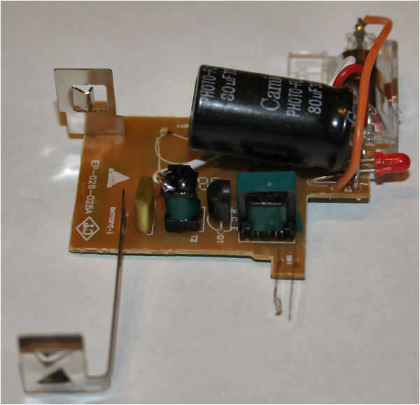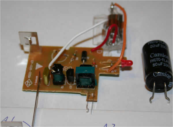 Retire el ensamblaje del lente a través de 2 tornillos y retire con cuidado la placa de circuito. Suele venir de plástico vivienda fácilmente. El circuito se muestra en la siguiente foto, se muestra el condensador con la mordedura grande en el lado derecho. Conseguir algo metálico con un mango de plástico que no importa dañar (como un destornillador viejo que hay que sustituir) y táctil a través de los condensadores que lleva. Si hay cualquier carga en el condensador será obtener chispas y tal vez una explosión. Podría perder un poco de su destornillador en este punto. Mejor el destornillador de que dedo.