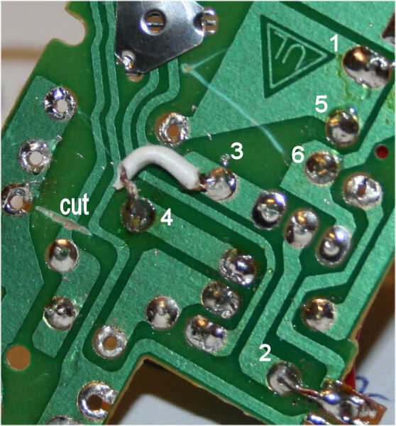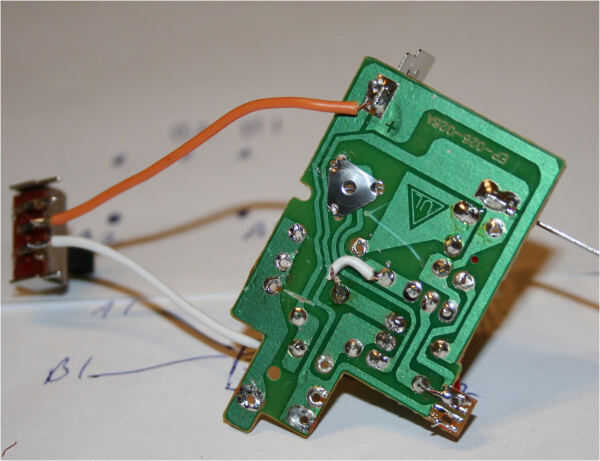 Soldar un cable a otro de los pines del interruptor y luego soldar el otro extremo de este cable a un pasado justo punto donde se corta la pista. Este es el blanco cable va en la tercera foto.