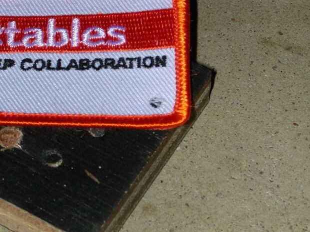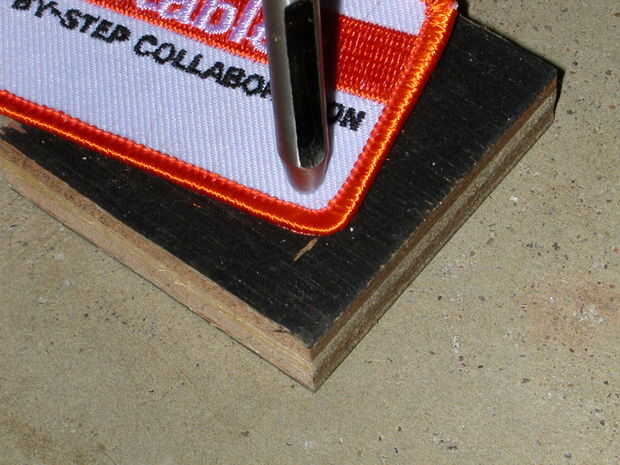 El primer paso es meter un agujero en el parche. En primer lugar, encontrar un punto claro (cerca del borde para facilitar agregar el llavero). Luego, la línea del golpe, colocar encima un poco de madera dura (no pino, sólo distorsiona), colocar todo en un piso de concreto (no dañar la madera) y darle un golpe bueno, sólido con el martillo. Que usted golpeó tenía lo suficiente para pasar por primera vez. También, que acordó sostener firmemente el golpe para que no caiga y dejar un borde irregulares.