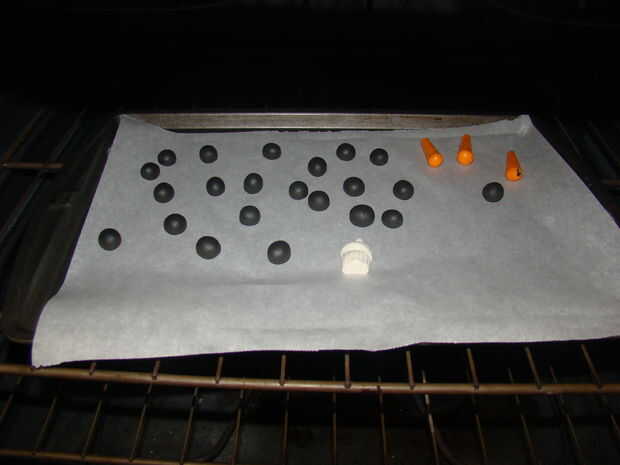Precalentar el horno a 275°.  Coloque la nariz naranja y ojos negros en una bandeja forrada con papel pergamino.  Cocer en el horno (durante 15 minutos por ¼ espesor de la arcilla) durante 30 minutos.