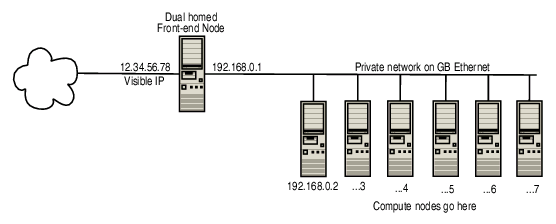 Esta imagen muestra cómo debe construirse la red. He utilizado un interruptor barato que he comprado fuera de ebay para conectar cada computadora que pude encontrar. Tenga en cuenta que la velocidad de su racimo depende de la velocidad de la red, así que usando gigabit de 10/100 vs hará una diferencia. También tenga en cuenta que desde el cluster será equilibrar la carga, los nodos que no pueden aportar mucho no te utiliza mucho.