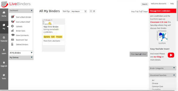 Después de crear su cuenta le llevará a dashboard LiveBinder. Aquí encontrarás tu primera carpeta que se titula "Tu primera carpeta". Para empezar a editar, mueva el cursor sobre la carpeta y haga clic en el botón amarillo con la etiqueta "Editar".