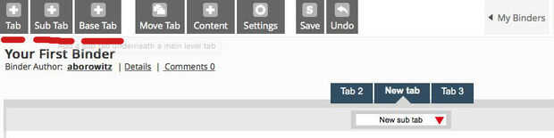 Los tres primeros están etiquetados "Tab", "Sub pestaña," y "Base". Estos controlan el número de pestañas o páginas en su LiveBinder.