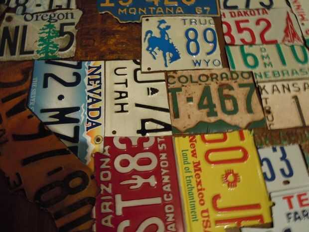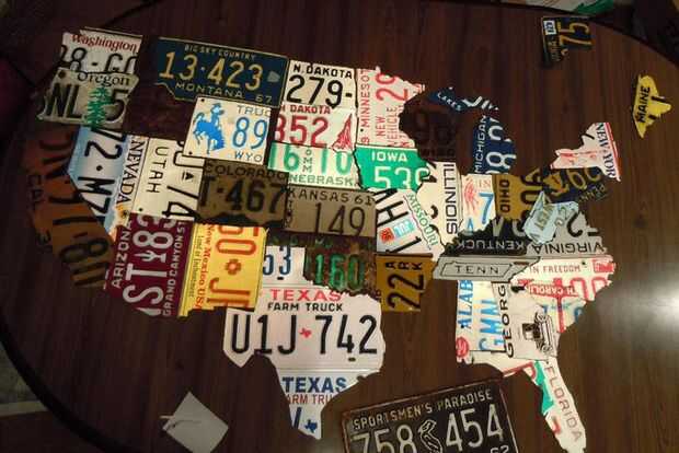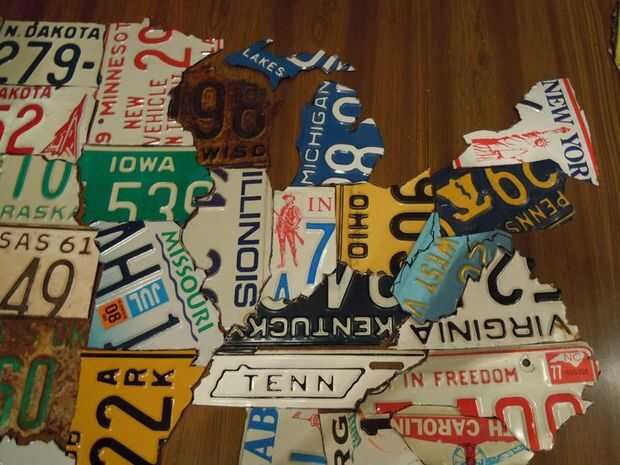 Placas! -Fui un poco exótico con ellos. Tiene una placa de cada Estado y trató de recoger los años que realmente tienen arte en ellos. Wyoming, Louisiana, Georgia, todos tienen elementos aseados estampados en ellos. Esto va a ser la preferencia que afecta el costo. Usted puede encontrar platos de $1 (o incluso gratis) hasta $100. Estados como TX y CA pueden requerir más de uno. Pequeños Estados como masa y R.I. no incluso demostración para arriba, usé sólo izquierda sobre chips de otros Estados con la inicial en ellas. Si desea sólo el nombre de Estados, le sugiero eBay. Están listados por estado. Controlar almacenes de basura locales. Es probable que tenga uno de su propio estado. Montana y Tennessee son los únicos Estados que he visto con la forma del estado en ellos. Necesita una escala de su proyecto.