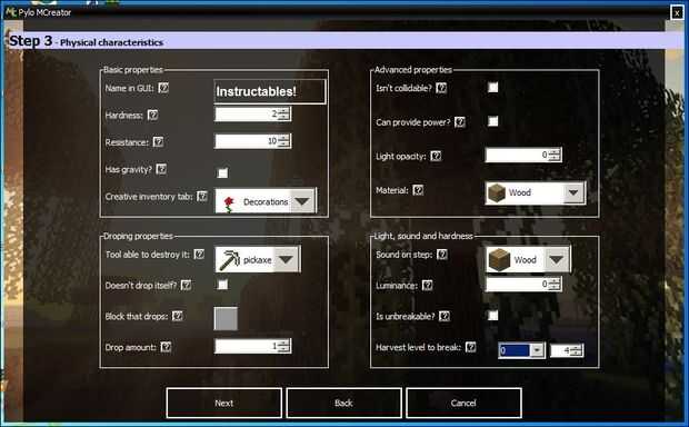 Aquí usted puede seleccionar es lo difícil de su bloque, da luz, herramienta de minería preferido, de paso, sonido tiene gravedad (como arena grava), proporciona energía de redstone, lo que cae, etc.. Vaya salvaje con ella y cuando haya terminado, haga clic en