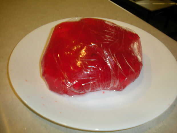 Para comenzar la moldura, colocar 2 piezas de 2 pies de abrigo de saran al lado de cada uno, ligeramente superpuestos. Puede entonces viertes la gelatina desde el recipiente en el abrigo de saran. Para cerrar, las 4 esquinas hacia los demás y seguir hacerlo con los bordes hasta que no haya ninguna abertura para la gelatina a escurrirse fuera de. Usar la ligadura para unir los bordes y voltear para que el extremo cerrado es por debajo y fuera de la vista.