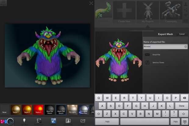 Si desea exportar el modelo a otro programa como el 123D o para imprimir, usted puede fácilmente hacer en las opciones del menú. El archivo será un archivo obj que puedes encontrar en iTunes bajo el 123D App de criatura.